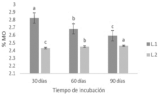La variabilidad en el contenido de materia orgánica, en respuesta a las diferentes enmiendas y dosis aplicadas, resultó ser estadísticamente significativa en ambas localidades estudiadas (Tabla 4). Esta determinación se encaja en el objetivo de analizar cómo las distintas enmiendas afectan la materia orgánica del suelo, un factor importante para la sostenibilidad del suelo y la productividad agrícola. La cal agrícola registró el mayor porcentaje de materia orgánica (% MO) con un valor de 3.23 %, superando a la ceniza (2.46 %) y al biocarbón (2.49 %) en L1. Sin embargo, en L2, el biocarbón presentó el mayor valor de % MO con 2.66 %, en comparación con la cal agrícola (2.31 %) y la ceniza (2.36 %) (Figura 6). En cuanto al tiempo de incubación, el % MO mostró una ligera disminución a medida que avanzaba el periodo de incubación en L1; por el contrario, en L2, los valores permanecieron constantes.