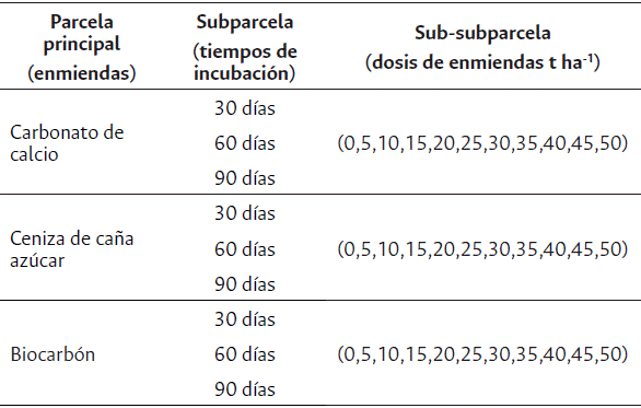 Para el desarrollo del estudio se planteó un experimento factorial en parcelas sub-subdivididas completamente al azar fraccionado en 3x3x11, en el cual se manipularon 3 factores de estudio: enmiendas orgánicas (carbonato de calcio, ceniza de caña de azúcar y biocarbón); tiempo de incubación (30, 60 y 90 días) y dosis de enmiendas (0, 5, 10, 15, 20, 25, 30, 35, 40, 45 y 50 t ha-1), lo cual generó 99 unidades experimentales por cada localidad. La parcela principal consistió en los 3 tipos de enmiendas edáficas; las subparcelas abarcaron 3 tiempos de incubación; y las sub-subparcelas incluyeron las 11 dosis de cada enmienda, incluido el control. Las combinaciones de tratamientos se replicaron 3 veces, de forma completamente al azar en las unidades experimentales a nivel del experimento, para lo que se utilizó la tabla de números aleatorios, por ello, cada unidad experimental presentó la misma probabilidad de recibir una combinación de tratamientos cualquiera. El ensayo se condujo entre febrero y junio de 2022, bajo un control adecuado del material y entorno experimental.