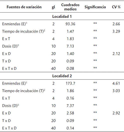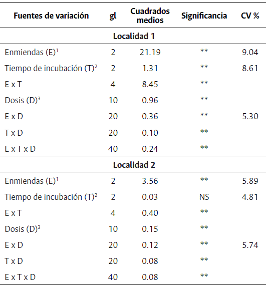 Para conocer si se presentaron o no diferencias estadísticas significativas entre las combinaciones de tratamientos generadas por los tipos de enmiendas, los tiempos de incubación y las dosis de enmiendas en función de los valores de pH en KCl, CE, % CO y % MO, se utilizó un análisis de varianza (ANOVA) factorial intergrupos, previo cumplimiento a los requisitos de normalidad de datos y homogeneidad de varianzas. Cuando se presentaron diferencias entre las combinaciones de tratamientos o los tratamientos en cada factor de estudio se aplicó la prueba de rangos y comparaciones múltiples de Tukey, mediante el software AGROESTAT® (Barbosa y Maldonado, 2010).
