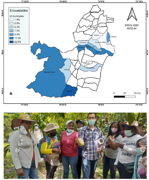Los agricultores de cacao fueron seleccionados mediante métodos de muestreo no probabilísticos, como el muestreo intencional y por conveniencia (Hernández y Carpio, 2019). La muestra estuvo conformada por 53 cacaoteros, de 14 municipios, los cuales se clasificaron en tres categorías agroecológicas: Jamundí, Guacarí, El Cerrito, Tuluá, Andalucía, Bugalagrande, Zarzal y La Unión, con características de Valles Interandinos Secos (VIS); Trujillo, Riofrío, Sevilla y Caicedonia, correspondientes a la Zona Marginal Baja Cafetera (ZMC) y Buenaventura y Dagua, clasificados como Bosque Húmedo Tropical (BHT), siguiendo la categorización de Rojas y Sacristán Sánchez (2013).