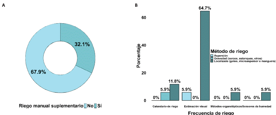 Entre los productores que irrigan sobresale el uso de mangueras, debido a su menor costo en comparación con otros sistemas presurizados, así como su facilidad de conexión a tomas de agua. Sin embargo, las mangueras presentan limitaciones de diseño hidráulico, por lo que es necesario tener en cuenta las recomendaciones ofrecidas por Rodrigues-Donato et al. (2021) acerca de la adopción de sistemas de riego localizado de alta frecuencia, que permitan una aplicación precisa y uniforme del agua, y que mejoren así la capacidad de las plantas para absorber nutrientes.