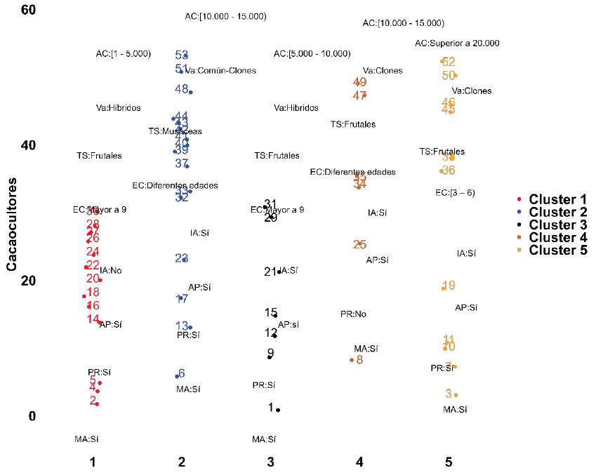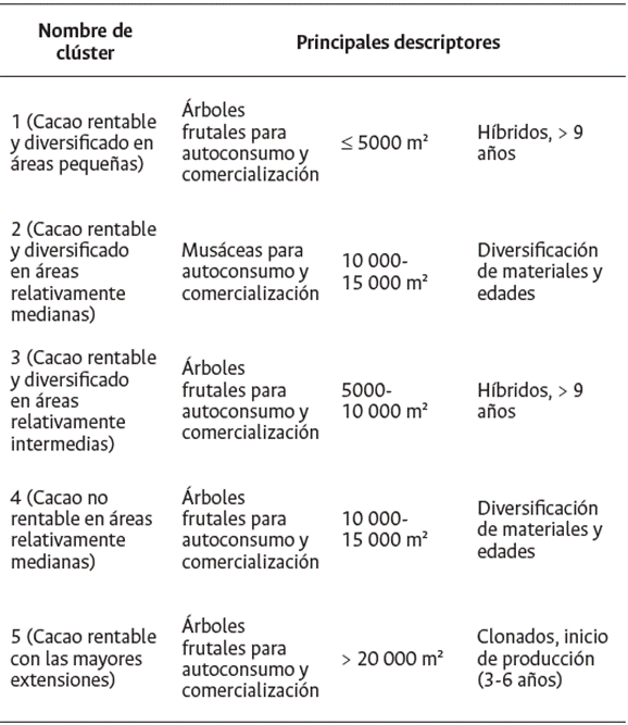 El análisis del grupo de producción revela que los clústeres 1, 2, 3 y 5 comparten características similares, ya que los productores consideran al cacao como un cultivo rentable. Los agricultores de estos clústeres muestran una clara intención de continuar con la producción de cacao debido a su rentabilidad. Además, estos productores combinan la producción de cacao con el cultivo de otros productos, como frutales, que no solo sirven como sombra para el cacao, sino que también generan ingresos adicionales, lo que contribuye a la diversificación económica de las fincas. En particular, en los clústeres 1 y 3, las plantaciones de cacao presentan una diversidad de materiales con edades superiores a 9 años, lo que sugiere la necesidad de renovar las plantaciones antiguas con materiales clonados de cacao que posean atributos mejorados relacionados con la producción.