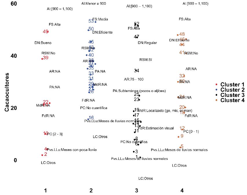 El grupo 2 abarcó 11 variables relacionadas con la gestión hídrica. Los productores se distribuyeron en cuatro clústeres, con 7, 17, 17 y 12 cacaoteros, respectivamente (Figura 5). Los principales descriptores del grupo 2 se presentan en la Tabla 4, donde cada clúster se identifica y caracteriza con un nombre específico.