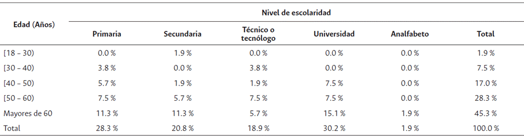 En la muestra, los productores de cacao presentaron una tendencia hacia edades mayores de 60 años, aunque también se identificó un grupo importante entre 50 a 60 años. En cuanto al nivel académico, predominó la formación universitaria, sin embargo, hubo quienes solo contaban con educación primaria. En términos generales, estos hallazgos revelan la distribución de los niveles educativos entre distintos grupos de edad de los cacaoteros del Valle del Cauca, destacando que las personas que superan los 60 años muestran un mejor grado de educación superior en comparación con los grupos más jóvenes encuestados (Tabla 1).