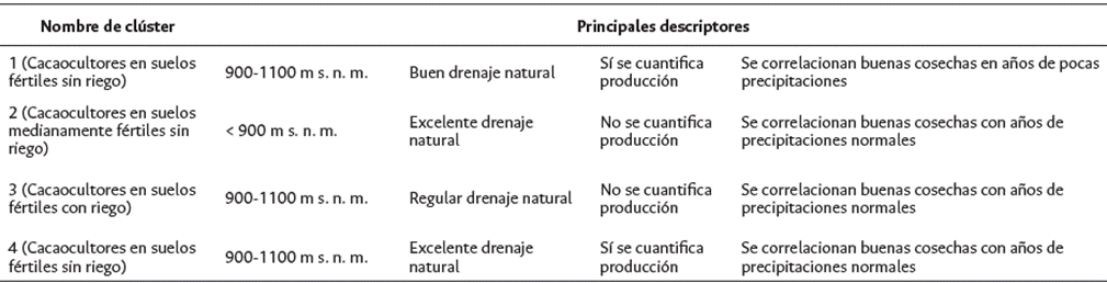 Los resultados de ambos grupos indican la necesidad de tener programas de capacitación y asistencia técnica adaptados a cada clúster, como lo sugieren Ordóñez-Espinosa et al. (2020)) y Anzules- Toala et al. (2018). Estos deben fomentar la adopción de tecnologías innovadoras en producción y gestión del agua, así como la renovación con materiales clonados de cacao y prácticas sostenibles de manejo del suelo. Finalmente, fortalecer la colaboración entre agricultores y entidades gubernamentales es fundamental para asegurar un desarrollo cacaotero sostenible y rentable en la región.