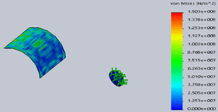 El material del escudo se designó como AISI 1010 (barra de acero laminada en caliente). La estructura fue un sólido de masa 7.71 kg, volumen:0.000979946 m3 y densidad 7870 kg m-3. El resultado del impacto provocó en la superficie más afectada una tensión de 1.503e08 N m-2 (Figuras 2 y 3).
