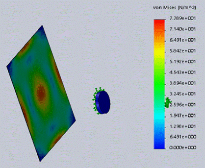 El material del escudo prototipo se designó como PC alta viscosidad. La estructura fue un sólido de masa 3.52716 kg, volumen 0.002964 m3 y densidad 1190 kg m-3. El resultado del impacto provocó en la superficie más afectada una tensión de 7.798e+001 N m^-2 (Figuras 4 y 5).