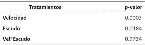 En la Tabla 1 se observa una diferencia significativa en los tratamientos entre la velocidad 5.0 km/h y 5.5 km/h con un p-valor = 0.0003. También se observa una diferencia significativa en los tratamientos de los tipos escudos utilizados, policarbonato y escudo original, con un p-valor = 0.0184. Por otro lado, se observa que no existe interacción entre los tratamientos de velocidad y escudo con un p-valor de 0.9734.