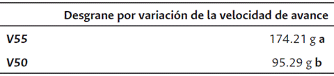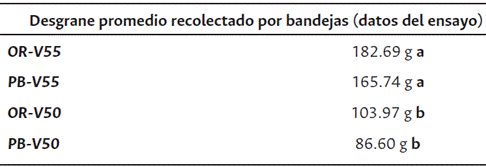 En la Tabla 2 se observó una diferencia significativa entre las medias de los tratamientos cuando se considera el cambio de velocidad; esta situación puede ocurrir cuando la máquina debe modificar la velocidad por las condiciones del terreno, la altura del cultivo y el aumento o disminución de la densidad de planta, entre otras. Como es sabido y se analizó en la sección de introducción, el aumento de velocidad en cosecha es proporcional al aumento de pérdidas de semillas, lo cual es un factor clave entre el equilibrio de una cosecha eficiente y la capacidad de trabajo óptima de la empresa prestadora del servicio de cosecha.