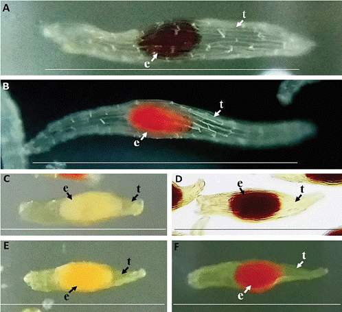 To evaluate the viability of the collected seeds, the syringe method was used (Salazar et al., 2020a), where a small amount of seeds was introduced in a sterile 6 mL syringe with a cloth filter, adding each of the pretreatments (deionized water, sucrose 10 %, chlorine 0.1 %, chlorine 0.2 %, and a control without pretreatment) in a span of 8 minutes for each one. This was followed by 4 washes with distilled water. The seeds were then subjected to two doses of tetrazolium (0.25 % and 0.5 %) in complete darkness for the time corresponding to each treatment (6, 12, and 24 h). At the end, the seeds were observed using an Olympus SZ61/SZ51 stereo microscope. Seeds that acquired a red coloration were considered viable, indicating respiratory activity (Salazar et al., 2020; Salazar et al., 2020b). On the other hand, seeds that showed no coloration were considered non-viable (Figure 2). Finally, the viability results were presented in percentages.