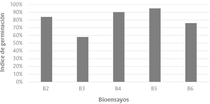 Índice de germinación. Los resultados obtenidos en la Figura 1 muestran que los bioensayos B2, B4 y B5 arrojaron los resultados más favorables. Esto concuerda con el criterio de Zucconi et al. (1981), que establece que un IG ≥ 80 % indica que la presencia de sustancias fitotóxicas es irrelevante o que están en concentraciones bajas. Flórez et al. (2020) lograron un índice de germinación superior al 80 % en semillas de lechuga al evaluar un fertilizante líquido obtenido a través de fermentación láctica con diluciones entre 0.1 % y 0.001 %. Urriola et al. (2021) reportaron que no hubo presencia de fitotoxicidad en semillas de pepino, obteniendo un índice de germinación de 118 % y 101 % con el tratamiento de estiércol de ave y aserrín, y con el tratamiento compuesto de cáscara de café, estiércol de ave y bovino, respectivamente.