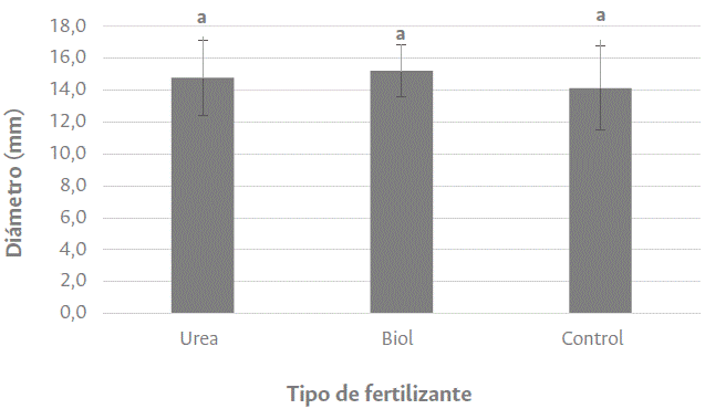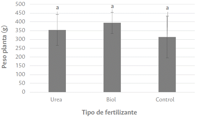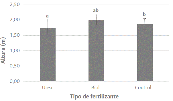 La Figura 2 muestra diferencias significativas en la altura de las plantas según el fertilizante utilizado. El tratamiento con urea resultó en la altura más baja (1.74 m), lo cual concuerda con Gutiérrez et al. (2022), quienes indican que el sulfato de amonio favorece una mayor altura en comparación con la urea. En contraste, el tratamiento con biol obtuvo un promedio de 2.01 m, lo que podría deberse al contenido de materia orgánica y nitrógeno adecuado para el desarrollo de las plantas. Barzan et al. (2022) sugieren que la altura de las plantas depende de la combinación y cantidad de nitrógeno, mientras que Jiménez et al. (2019) destacan que el estiércol compostado y G. intraradices mejoran la absorción de nutrientes y, por ende, el crecimiento de las plantas.
