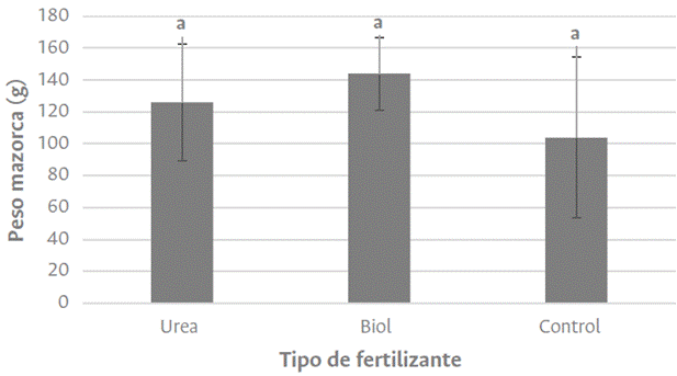 En el análisis estadístico no se encontraron diferencias significativas entre los tratamientos (ver Figura 5). El peso de las mazorcas en el tratamiento con biofertilizante fue de 144 g y en el de control fue de 103.04 g, sin que estas diferencias fueran estadísticamente relevantes. Esto podría deberse a la falta de nutrientes en el suelo. Pierre et al. (2023) sugieren que la combinación de micorrizas y biol puede aumentar la producción de maíz en suelos poco fértiles. De igual forma, Moreno et al. (2020) tampoco encontraron diferencias significativas en el peso de la mazorca de maíz chala, siendo el tratamiento con estiércol sólido y fertilizante químico el que mostró un peso promedio de 270 g. Por su parte, Bedoya y Julca (2021) observaron una mejora en el peso con mayores dosis de estiércol vacuno. Finalmente, Ayvar et al. (2020) recomendaron combinar fertilización química y biológica para optimizar la producción de maíz híbrido y reducir el impacto ambiental.