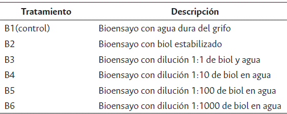 Para llevar a cabo esta prueba, se tomó como base lo descrito por Ramírez y Mendoza (2008), pero se emplearon en los diferentes bioensayos semillas de pepino (Cucumis sativus) de la variedad Fercon cohombro Poinsett 76, con un poder germinativo del 98 %. Estas semillas fueron seleccionadas debido a su alta sensibilidad frente a los compuestos fitotóxicos de los fertilizantes, lo que las hace adecuadas como indicadores biológicos en pruebas de fitotoxicidad determinadas por bioensayos de germinación (Wang y Keturi, 1990). Se realizaron 5 bioensayos empleando diferentes diluciones con agua destilada y lixiviado, además de un tratamiento de control con agua dura; de igual manera, en 3 de los tratamientos se utilizó el método de las diluciones seriadas.