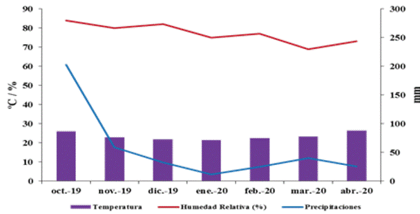 La investigación se efectuó en áreas de la Finca “La Jaula”, ubicada a 23º 01’ latitud norte y 82º 08’ longitud oeste, en la Llanura La Habana, Matanzas, a una altura de 130 m s. n. m., en el municipio de San José de las Lajas, provincia de Mayabeque, Cuba (INSMET, 2022). El montaje del experimento se realizó durante la campaña 2019 - 2020, cuyas variables climatológicas (temperatura [C], humedad relativa [%] y precipitaciones [mm]) se muestran en la Figura 1. Según la nueva versión de la clasificación genética de los suelos de Cuba de Hernández et al. (2015), el suelo de la finca corresponde a un suelo Pardo Sialítico, con un contenido de materia orgánica de 5.59 % y pH de 7.8.