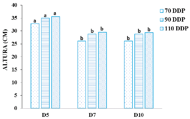 Los resultados para el indicador altura de las plantas a los 70, 90 y 110 DDP en las diferentes distancias de plantación se presentan en la Figura 2. En todos los momentos de evaluación, la altura de las plantas del tratamiento D5 fue significativamente superior al resto de los tratamientos.