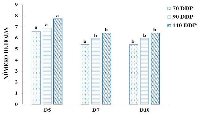 En el indicador número de hojas se observó un comportamiento similar (Figura 3), donde los valores en el tratamiento D5 fueron significativamente superiores en todos los momentos de evaluación al compararlos con los demás tratamientos.