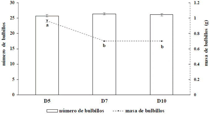 En correspondencia con los resultados obtenidos en los indicadores del bulbo, se observan los valores de los indicadores número y masa de bulbillos (Figura 4). Para el indicador número de bulbillos, no se encontraron diferencias significativas entre los tratamientos, comportamiento que también se observó en las diferentes distancias de plantación.