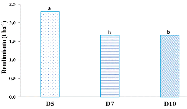 Consecuentemente, se obtuvo un mayor rendimiento del cultivo cuando la plantación se realizó con un distanciamiento entre plantas de 5 cm (Figura 5), superando el valor de rendimiento de la media nacional de 2 t ha-1 (Pupo Feria et al., 2016). Los valores de rendimiento del cultivo, así como las otras distancias entre plantas ensayadas en este trabajo, quedaron por debajo de este valor.