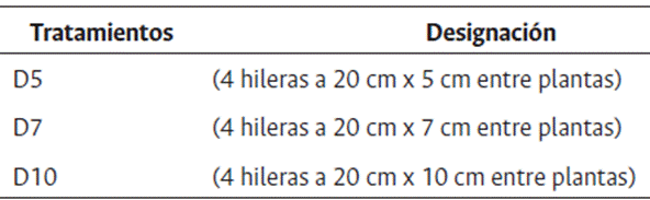 En el mes de octubre, óptimo para la plantación, se plantaron tres canteros compuestos por abono orgánico (estiércol vacuno) y suelo en una proporción del 50 %. Antes de levantar los canteros, se mezclaron homogéneamente. Cada uno de ellos tenía una dimensión de 20 m de largo, 1.40 m de ancho y 0.30 m de profundidad, y se establecieron tres distancias de plantación diferentes: 5, 7 y 10 cm de distancia (tratamientos D5, D7 y D10, respectivamente) (Tabla 1), incluyendo la establecida para este cultivo según el instructivo técnico (Casanova et al., 2013).