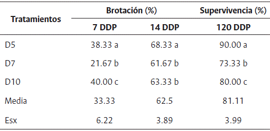 Los resultados del porcentaje de brotación y supervivencia de las plantas de ajo en función de la distancia de plantación (Tabla 2) mostraron que a los 7, 14 y 120 DDP, el mayor porcentaje de brotación y supervivencia se presentó con la distancia de 5 cm (D5), seguido de D7 y D10, en todos los momentos de evaluación.