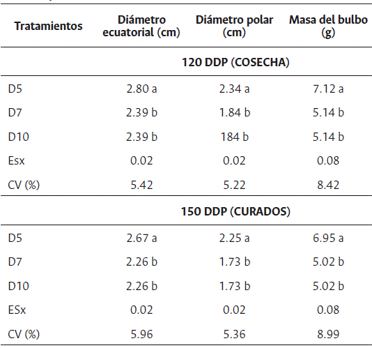 Los resultados de los indicadores de bulbos de ajo en función de tres distancias de plantación se presentan en la Tabla 3. Tanto en el momento de la cosecha como a los 30 días después de esta, se obtuvieron valores significativamente mayores cuando la distancia entre plantas fue de 5 cm (D5). Las otras distancias entre plantas en estudio, D7 y D10, no difirieron entre sí.