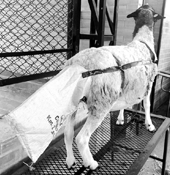 Durante los días 30, 31 y 32 del periodo experimental se realizó un ensayo digestivo con el objetivo de determinar el consumo y la digestibilidad de los compuestos nutricionales presentes en la dieta. El consumo de heno y del suplemento fue determinado de forma individual por la diferencia entre la cantidad ofertada menos las sobras obtenidas 24 horas después de la oferta. La excreción de heces fue determinada por colecta total durante 24 horas utilizando bolsas colectoras tipo arnés (Figura 1), adaptadas al cuerpo de cada individuo. Dichos procesos fueron realizados de manera consecutiva durante los tres días del ensayo digestivo; el consumo y la excreción fueron calculados como el promedio de los días de colecta (Contreras-Márquez et al., 2020).
