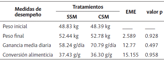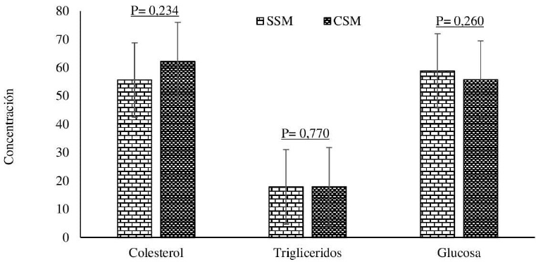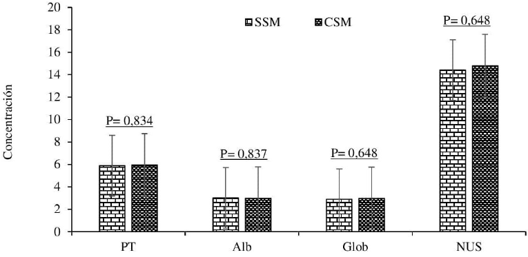 No se presentaron diferencias significativas (p > 0.05) en las concentraciones plasmáticas de proteínas totales, albúminas, globulinas y nitrógeno ureico en los animales de ambos tratamientos (SSM y CSM) (Figura 2).