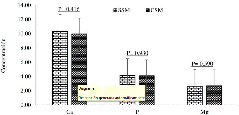 Considerando que la respuesta animal ante situaciones de deficiencias nutricionales está representada principalmente por procesos compensatorios como aumento en la ingesta de alimento o el consumo de partículas extrañas que no hacen parte de la dieta y que pueden generar procesos patológicos “pica o malacia” (Borgna- Pignatti y Zanella, 2016), junto con comportamientos de geofagia (Mahaney y Krishnamani, 2003), se podría inferir que los animales del tratamiento SSM presentaron deficiencias de minerales, proceso que motivó el aumento en el consumo de materia seca de pasto, y por ende el consumo de todos los compuestos nutricionales presentes en la dieta. Este proceso compensatorio por parte de los animales del tratamiento SSM explica la ausencia de diferencias estadísticas en cuanto a las concentraciones sanguíneas de los minerales Ca, P y Mg, evaluados en la presente investigación. Para el caso del Ca, resultados similares fueron encontrados en el trabajo realizado por Moyano-Tapia et al. (2020), donde la suplementación mineral en ovejas Blackbelly no mejoró las concentraciones plasmáticas en comparación con los animales no suplementados. Sin embargo, a diferencia de la presente investigación, en estudios previos, la suplementación mineral sí elevó las concentraciones séricas de fósforo y magnesio (González-Reyna et al., 2016; Rahnema y Fontenot, 1983).