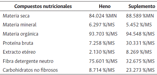 En la Tabla 1 se puede observar la composición nutricional del heno y del suplemento ofertado a los animales durante el periodo de investigación.