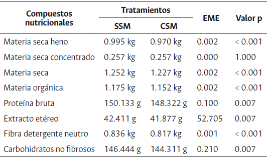 Animales SSM presentaron mayor consumo de materia seca de heno (MSH), MS, MO, PB, EE, FDN y CNF en comparación con animales del tratamiento CSM (p < 0.001) (Tabla 3).
