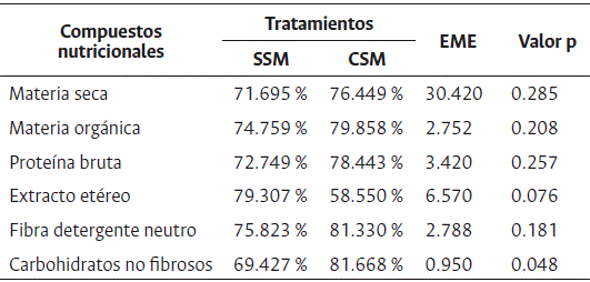 No se observaron diferencias significativas (p > 0.05) en la digestibilidad de los compuestos nutricionales (MS, MO, PB, EE y FDN) en función de la suplementación mineral inyectable. Los animales del tratamiento CSM presentaron mayor digestibilidad de los carbohidratos no fibrosos (p = 0.048) en comparación con los animales del tratamiento SSM (Tabla 4).