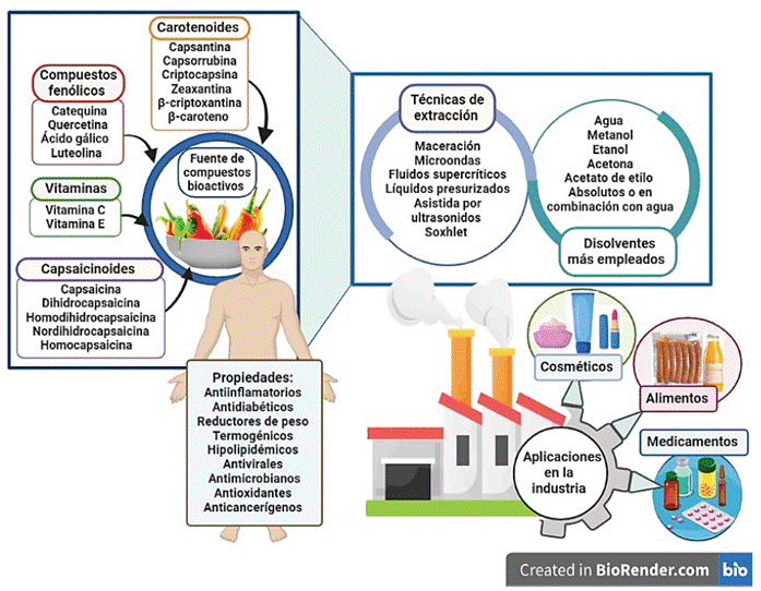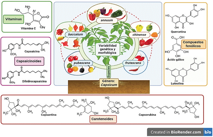 El chile (Capsicum sp.) es un fruto ampliamente conocido y consumido en todo el mundo, utilizado principalmente como especia para dar color, sabor y picor a los alimentos (Ferysiuk et al., 2020). Entre las variedades más relevantes se encuentran: habanero, serrano, piquín, jalapeño, poblano y anaheim. En los últimos años, el chile ha ganado popularidad no solo por su uso como condimento, sino también por sus beneficios para la salud, que incluyen propiedades antimicrobianas, antivirales, antiinflamatorias, y antioxidantes (Dinu et al., 2018; Villasante et al., 2020). Gracias a sus propiedades antioxidantes, el consumo del chile ayuda a reducir la oxidación celular causada por radicales libres, disminuyendo así el riesgo de desarrollar enfermedades asociadas con el estrés oxidativo, como cataratas, cáncer, alzhéimer, diabetes, párkinson y enfermedades cardiovasculares (Kaur y Kapoor, 2001; Chávez-Mendoza et al., 2015). Estos beneficios se deben principalmente a la presencia de compuestos bioactivos, como carotenoides, vitaminas C y E, minerales, capsaicinoides (capsaicina, dihidrocapsaicina, homodihidrocapsaicina, nordihidrocapsaicina y homocapsaicina) y compuestos fenólicos como los ácidos fenólicos, la quercetina y luteolina (Hernández-Pérez et al., 2020) (Figura 2).