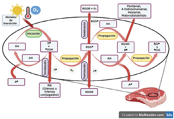 En la propagación, los radicales alquilo reaccionan con el oxígeno molecular, formando radicales peroxi. Estos, al reaccionar con otros lípidos, generan hidroperóxidos y más radicales alquilo. Los hidroperóxidos se descomponen, produciendo compuestos como pentanal, 4-hidroxinonenal, hexanal y malondialdehido, que alteran las características nutricionales y sensoriales de la carne. Además, estos productos pueden inducir enfermedades inflamatorias, aterosclerosis y algunos tipos de cáncer (Manessis et al., 2020). Finalmente, en la terminación, los radicales libres forman productos estables e inestables que reducen la calidad sensorial de la carne. Este proceso puede ocurrir de dos maneras: a través de la reacción entre radical- radical, formando un aducto no radical, o mediante la acción de antioxidantes, que estabilizan los radicales donando átomos de hidrógeno (Tomović et al., 2017).