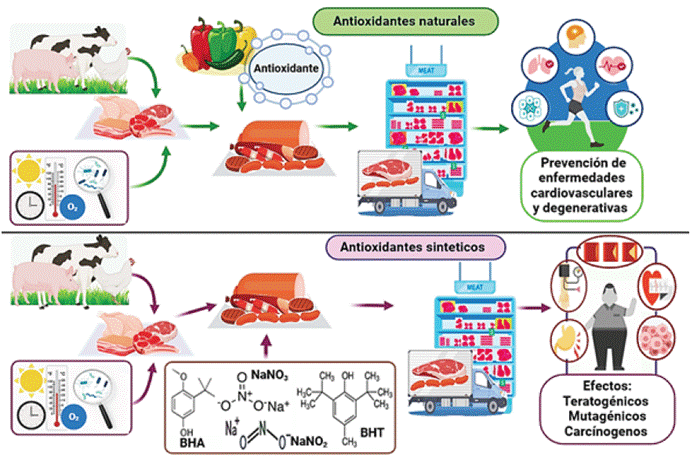 La creciente preocupación por los riesgos asociados al uso de conservantes sintéticos ha motivado a los consumidores a reducir su consumo y ha llevado a la industria a buscar alternativas naturales, que no constituyan un riesgo para la salud y que además sean saludables para la conservación de la carne y productos cárnicos (Villasante et al., 2020) (Figura 4).