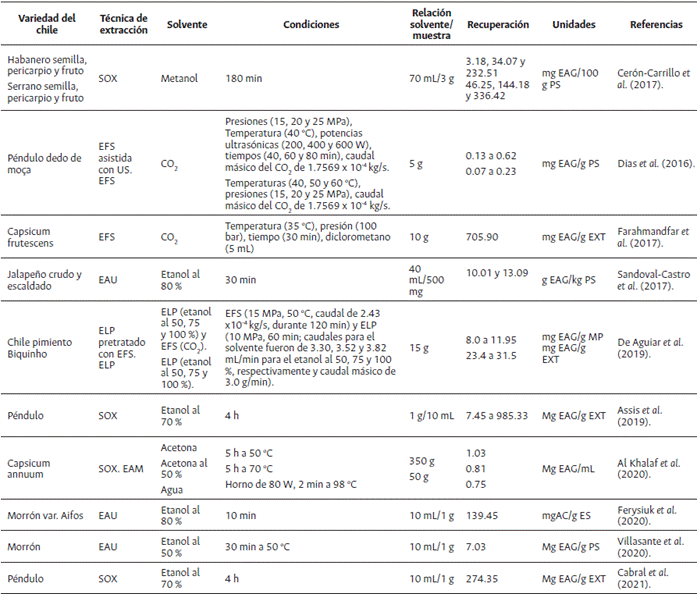 Los frutos del chile son reconocidos por su diversidad en colores, sabores y niveles de picor, además de su contenido en compuestos fenólicos, que son moléculas fitoquímicas con propiedades bioactivas benéficas para la salud humana. Entre los compuestos fenólicos que más destacan en diversas variedades del chile se encuentran el ácido clorogénico, ácido cafeico, la miricetina, quercetina y luteolina (Blanco- Ríos et al., 2013). Sin embargo, la concentración de estos compuestos varía debido a factores como el grado de madurez, condiciones de almacenamiento y tipo de cultivo, así como por la naturaleza de las uniones entre las moléculas fenólicas y la matriz vegetal. Estas moléculas pueden encontrarse como agliconas o glucósidos, estructurados de forma monomérica o polimerizada, lo que complica su extracción (Alara et al., 2021). Por tanto, la elección de la técnica de extracción adecuada es crucial para evitar la degradación de estos compuestos y maximizar su recuperación. Esta sección se enfocará en revisar las técnicas de extracción de compuestos fenólicos utilizadas en frutos de distintas variedades de chiles (Tabla 1).
