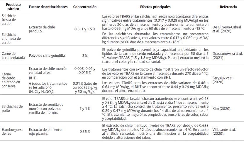 Aunque son limitados, algunos estudios han evaluado los efectos antioxidantes de los compuestos fenólicos presentes en diferentes variedades del chile, con el objetivo de conservar e incluso mejorar la calidad organoléptica de los productos cárnicos (Tabla 2). En particular, Draszanowska et al. (2021) investigaron la adición de chile guindilla en polvo al 3 % en carne de cerdo enlatada, pasteurizada y almacenada durante 50 días. Los resultados mostraron que el chile guindilla mejoró la aceptación del producto al reducir el aroma graso y mantener características sensoriales agradables durante el almacenamiento, en comparación con el BHT, que mostró sabores y olores indeseados.