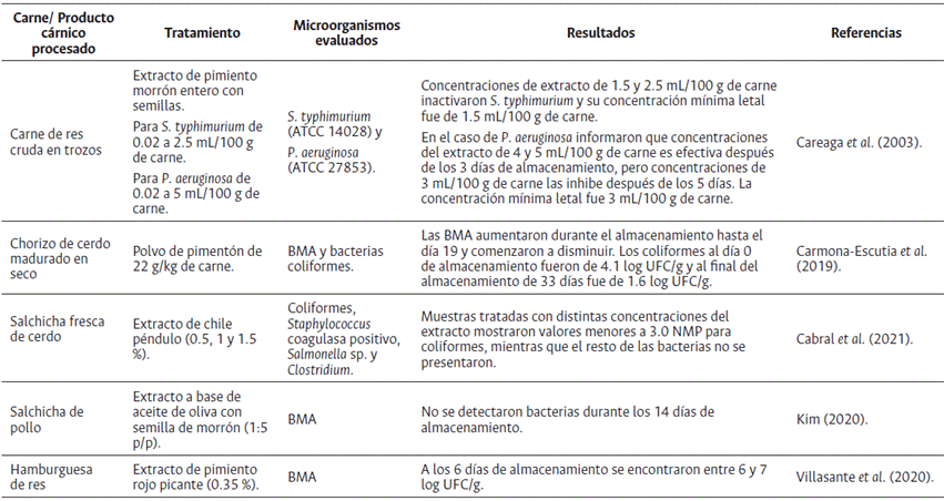 El chile (Capsicum sp.), además de su uso alimentario, ha sido valorado en la medicina tradicional por sus propiedades antimicrobianas, atribuibles a compuestos bioactivos como los compuestos fenólicos. Estas moléculas han mostrado eficacia contra bacterias como Bacillus cereus, Salmonella typhimurium, Listeria monocytogenes y Staphylococcus aureus en estudios in vitro (Careaga et al., 2003). Por su parte, Villasante et al. (2020) confirmaron la actividad antimicrobiana del extracto de chile morrón rojo contra bacterias Gram positivas, como L. monocytogenes y M. luteus. Cerón-Carrillo et al. (2017), también reportaron que extractos de chile serrano y habanero son más efectivos contra L. monocytogenes que contra E. coli. A pesar de estos hallazgos, el número de estudios que exploran el efecto antimicrobiano de los compuestos fenólicos del chile en sistemas cárnicos es aún limitado (Tabla 3).