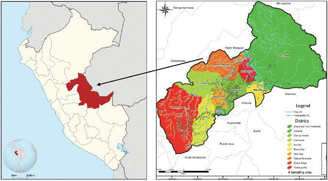 The study was conducted in the Peruvian provinces of Coronel Portillo and Padre Abad, located in the department of Ucayali (Figure 1). Covering an area of approximately 102 410 km2 (39 536 sq mi), the region is located in the eastern part of the country and encompasses portions of the Amazon basin. The region’s climate is typically hot and humid. The average annual precipitation is approximately 1500 mm in Coronel Portillo and 2000 mm in Padre Abad, with the dry season typically spanning from June to August.