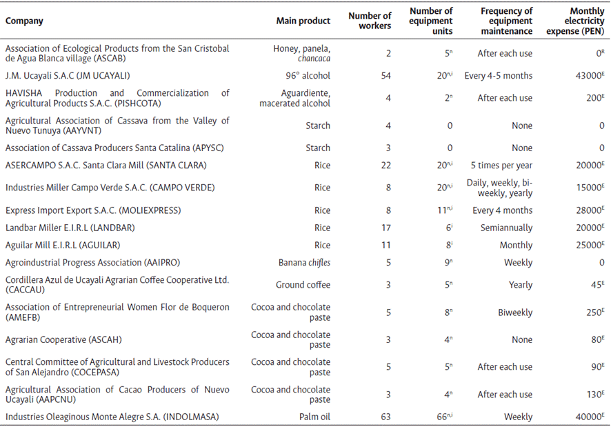 In smaller agro-industrial enterprises, operational sustainability is heavily reliant on the cohesion and partnership among members. The failure of many such enterprises is often due to internal conflicts and lack of strong organizational structures. Regarding health and safety, only a few companies have implemented comprehensive systems, with only Santa Clara and Moliexpress fully enforcing these programs. Notably, none of the companies surveyed have ISO 14001 certification for environmental management, although two of them, Landbar and Indomalsa, have ISO 9001 certification, indicating a commitment to quality management. The energy consumption in these enterprises is minimal, often due to the artisanal nature of their production processes which mainly utilize mechanical energy and gas, with some even reporting no energy costs. A few have low electricity costs due to reliance on artisanal methods, and one company has invested in solar panels to offset energy expenses, reflecting the small scale and low-tech operations prevalent in these firms.