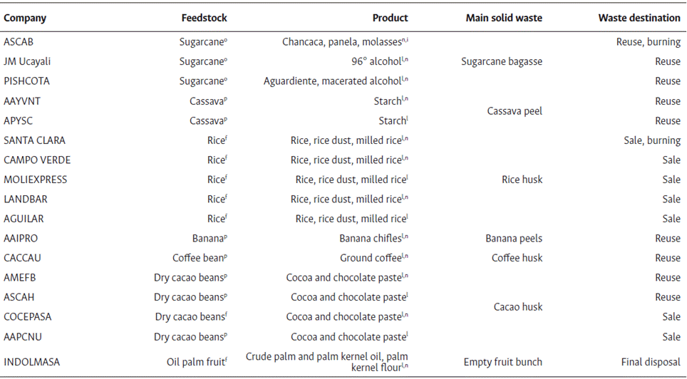 Surveys were administered in October and November 2020 to companies involved in the processing of sugarcane (Saccharum officinarum), rice, cassava, plantain, coffee (Coffea arabica), cocoa, and palm oil. During each company visit, a structured survey (Table S2) comprising both closed and open-ended questions was used to gather data on their production, raw material consumption, waste generation, access to basic services, and environmental management practices. Operational managers provided flow charts data (Figure S1).