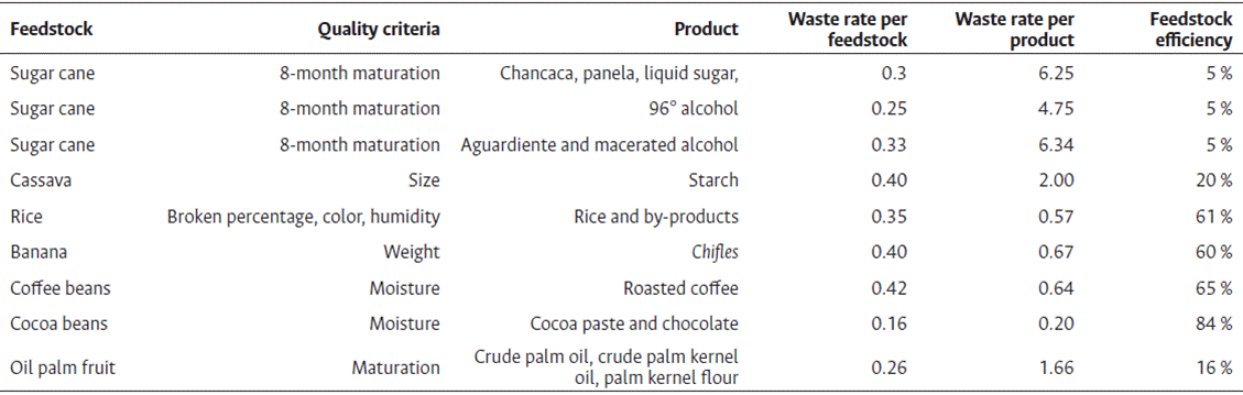 Table 3 presents the average rates of solid waste generation and feedstock efficiency. As an illustration, for every ton of rice produced, 0,57 tons of rice husks are generated. In comparison, Spada et al. (2020) documented a waste generation rate of 0.23 tons per ton of rice produced. This discrepancy could be accounted for by differences in processing efficiency or variations in feedstock quality. For palm oil processing, a yield of 16 % was computed, which aligns with the findings by Dungani et al. (2018). This implies that the remainder of the processed materials is waste. Similarly, the yield of cassava processing for starch was recorded at 20 %, which is consistent with the findings of Ekop et al. (2019), who reported that every ton of fresh cassava processed results in 680 kg of total waste. However, this study only accounted for waste derived from cassava peels. Cocoa husk makes up 52 % to 75 % of the total wet weight of the fruit (Lubis et al., 2018). However, in this study, cocoa husk represents 16 % of the dry seed weight, suggesting an 84 % yield of waste. The quantity of sugarcane bagasse generated per ton of processed sugarcane aligns with the findings by Toscano Miranda et al. (2021), who calculated that each ton of sugarcane results in approximately 270 kg of sugarcane bagasse. However, other studies (Xu et al., 2018) have posited that sugarcane bagasse constitutes up to 50 % of the total volume of processed sugarcane. According to existing literature, the coffee industry generates between 500 kg and 600 kg of husks for every ton of processed coffee (Morales-Martínez et al., 2021), which is in line with this study. However, some research (Dadi et al., 2019) suggests a lower waste generation rate, stating that each ton of coffee produced results in just 1 kg of husk during the drying process.