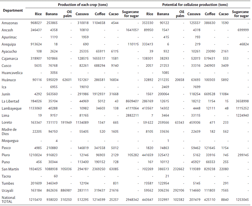Table 4 presents the estimated solid waste generation and cellulose pulp yield for each crop studied, based on national production figures. Sugarcane processed for sugar production showed the highest levels of waste and cellulose pulp generation among all the crops analyzed.