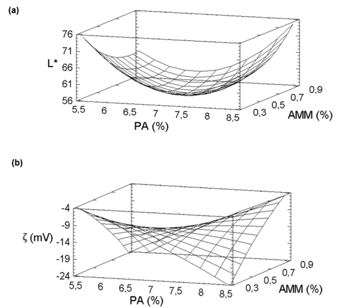El coeficiente de determinación (R2) sugiere que el modelo explica el 51,8 % de variabilidad de los datos. La Figura 1(a) muestra una relación cuadrática entre L* y PA (p = 0.026), indicando que L* tiende a maximizarse para valores extremos de PA. Las concentraciones óptimas de PA y AMM para un mayor valor de L* (72.2) fueron 5.6 % y 0.3 %, respectivamente.
