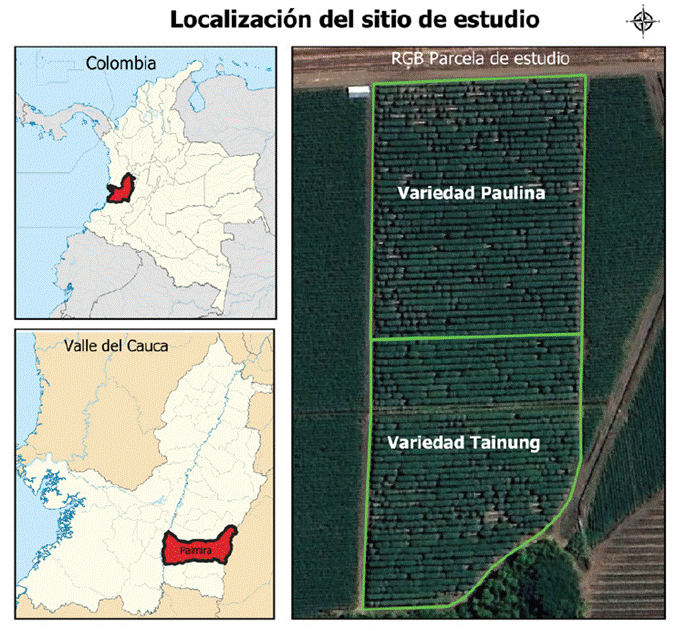 El presente estudio se realizó en una parcela ubicada en las afueras de la ciudad de Palmira, Valle del Cauca, Colombia (Figura 1), con coordenadas 3°33’12”N 76°15’27”W y 1057 m s. n. m., perteneciente a la empresa Proterra, entre enero y diciembre del 2023.