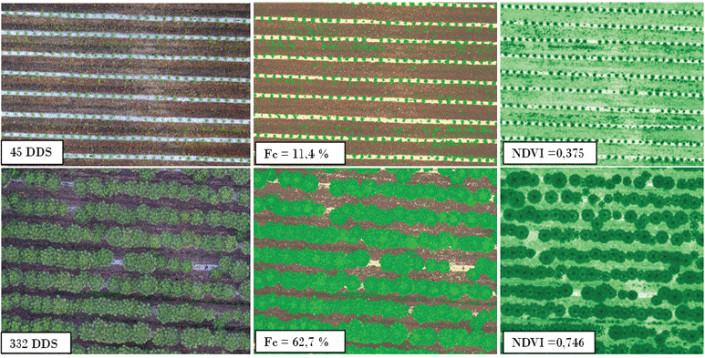 En la Figura 3c se exponen los resultados asociados al comportamiento del NDVI y la Fc a lo largo del ciclo del cultivo de C. papaya en el híbrido Paulina. Los resultados mostraron un NDVI máximo de 0.85 (213 DDS) y una Fc de 60.6 % (332 DDS). El NDVI máximo se evidenció aproximadamente al octavo mes después de la siembra, lo que coincidió con el inicio de la etapa de cosecha. Igualmente, de observó una disminución del NDVI y de la Fc desde el día 213 (DDS); esta disminución puede deberse al corte de árboles de C. papaya como medida de control de enfermedades (Figura 4) y el comienzo de la cosecha y senescencia del cultivo, el cual coincide con el estancamiento del diámetro del tallo (Figura 4b).