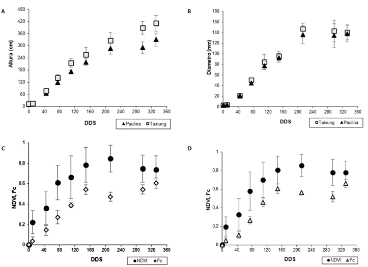 En la Figura 3a se muestran los resultados de la evolución de altura en los 2 híbridos de C. papaya. Estos muestran una altura máxima de 330.8 cm en el híbrido Paulina y 411.5 cm en el híbrido Tainung, para la fecha final del estudio (332 DDS), debido al crecimiento de la planta que es constante a lo largo de su ciclo. Algunas plantas de C. papaya sufren doblamiento del tallo, lo que impide el crecimiento totalmente vertical y, al realizar las mediciones aleatorias, se reflejó el incremento de la desviación estándar.