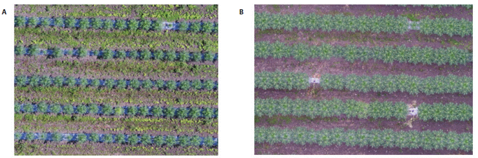 De los ortomosaicos RGB se determinó la fracción de cobertura (Fc); para esto se tomó de referencia la metodología propuesta por Cihlar et al. (1987), que está basada en clasificación supervisada de imágenes de alta resolución en el software Qgis; se utilizó el complemento de clasificación semiautomática con un algoritmo de mapeo de ángulo espectral y se asignaron clases a los diferentes pixeles de suelo, plástico y vegetación. Igualmente, se obtuvieron los porcentajes de fracción de cobertura, como se muestra en la Figura 2. Para observar la variabilidad de la Fc en cada híbrido se dividió cada lote en 4; de estas divisiones se calculó el promedio y la desviación estándar en cada fecha.