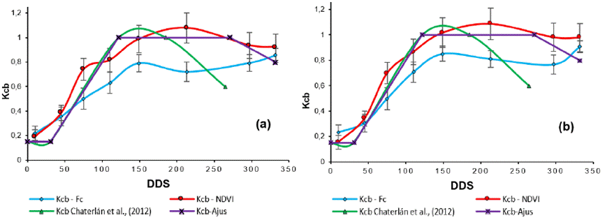 Las diferencias encontradas con respecto a la curva de Kcb reportada en la literatura resaltan la importancia de considerar variaciones ambientales, como temperatura, viento, fotoperiodo, altitud, humedad relativa y calidad del suelo, para determinar el Kcb, para lo cual los modelos basados en el NDVI y la Fc son una estrategia sencilla.