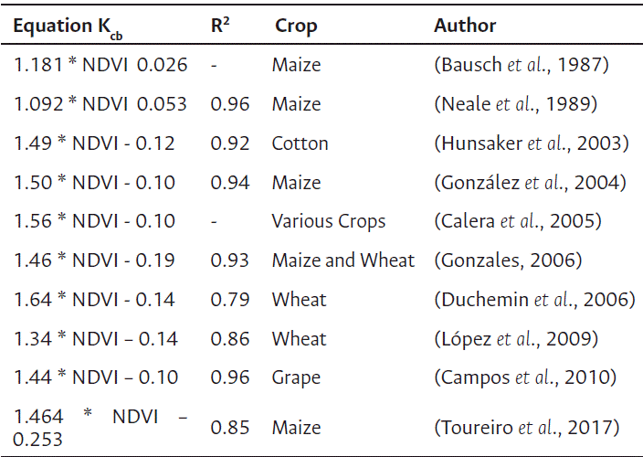 Actualmente se ha incrementado el uso de datos de teledetección para evaluar la ET de los cultivos y el estrés hídrico, proporcionando información espacial. Los IV, como el índice de vegetación de diferencia normalizada (NDVI), han sido relacionados empíricamente con el Kcb (Guerrero y Torres, 2022; Ortiz y Torres, 2018) y aplicados a la evapotranspiración de referencia (ETo) para estimar el consumo de agua de los cultivos, como es el caso del estudio de Bispo et al. (2022); también se han desarrollado siguiendo la metodología de la FAO56 (Segovia et al., 2019). En el estudio de Zhang et al. (2023) se realizó un estudio sobre la relación del IV con el Kcb en el cultivo de maíz. De igual forma, en el cultivo de uva y trigo se ha estimado la evapotranspiración utilizando datos de IV, como lo muestran Vanino et al. (2015).